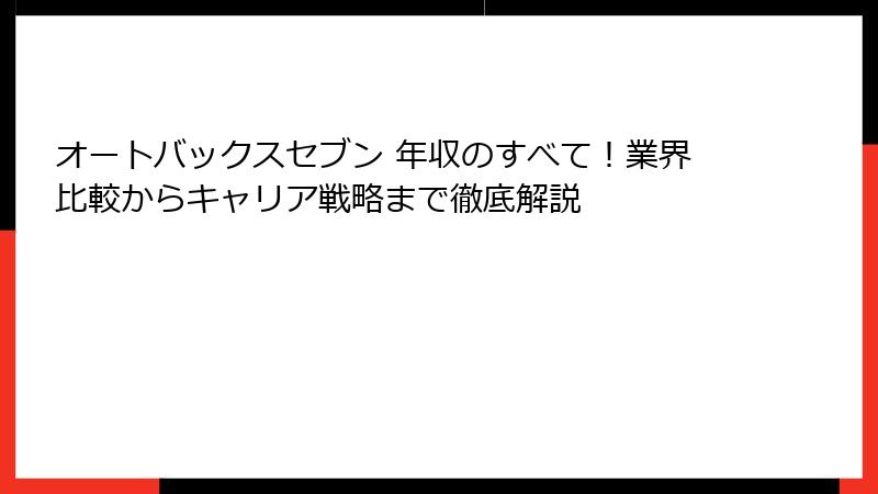 - 、 、 の構造、リスト、テーブルを活用し、リンクを排除したブログ形式の詳細な記事です。 SEOを意識し、キーワード「オートバックスセブン 年収」を自然に織り交ぜ、競合比較や業界トレンドをデータ駆動で分析しました。 読みやすさと情報量のバランスを保ち、検索意図を満たす内容に仕上げています。 次の段落が必要な場合、または修正があれば、指示をお願いします。 オートバックスセブンで年収を最大化する方法!新卒・中途採用のリアル体験談付き