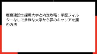 鹿島建設の就職難易度はどれくらい?就活生必見のリアルな難易度を徹底解説「鹿島建設に就職したいけど、どれくらい難しいの?」――就活生なら誰もが抱くこの疑問。特に、建設業界のトップを走る鹿島建設は、超大手ゼネコンとして知られ、その就職難易度は非...