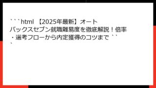 オートバックスセブンへの志望動機が採用の鍵を握る理由オートバックスセブンは、日本最大級のカー用品チェーンとして、自動車業界におけるリーディングカンパニーであり、求職者にとって魅力的なキャリアの場です。全国に約600店舗を展開し、年間売上高は...