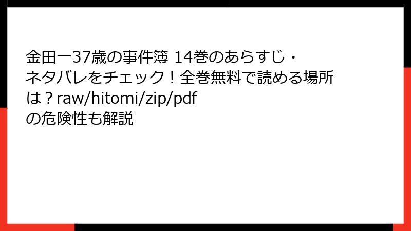 こんにちは、漫画好きの皆さん! 人気シリーズ『金田一37歳の事件簿』第14巻の魅力にハマり、つい手軽な海賊版サイト(raw、hitomi、zip、pdf、漫画バンクなど)に手を出したくなる気持ち、わかります。でも、待って! そんなサイトで読むのは、意外と危険がいっぱい。今日のブログでは、この巻を例に挙げながら、海賊版のリスクを法律・セキュリティ・倫理の観点から詳しく掘り下げます。合法的に楽しむための参考に、しっかり読み進めてくださいね。ミステリーの謎解きみたいに、隠れた罠を暴いていきましょう!