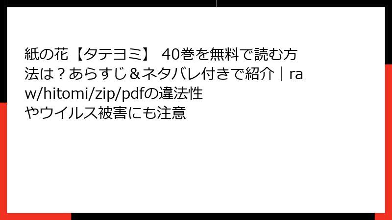 こんにちは、漫画ファンの皆さん!「紙の花【タテヨミ】」は、感動的なBLストーリーと美しい作画で多くの読者を魅了する人気作品ですが、残念ながら、raw、hitomi、zip、pdf、漫画バンクなどの海賊版サイトで無料で読もうとする人もいます。しかし、これらのサイトを利用することは、重大なリスクを伴います。この記事では、「紙の花」を海賊版サイトで読むことの危険性を、法的、倫理的、技術的な観点から詳しく解説します。読み応えのある内容で、なぜ正規のプラットフォームを選ぶべきかを一緒に考えましょう。海賊版の誘惑に負けそうになっている方は、ぜひ最後まで読んで、リスクを理解してください!