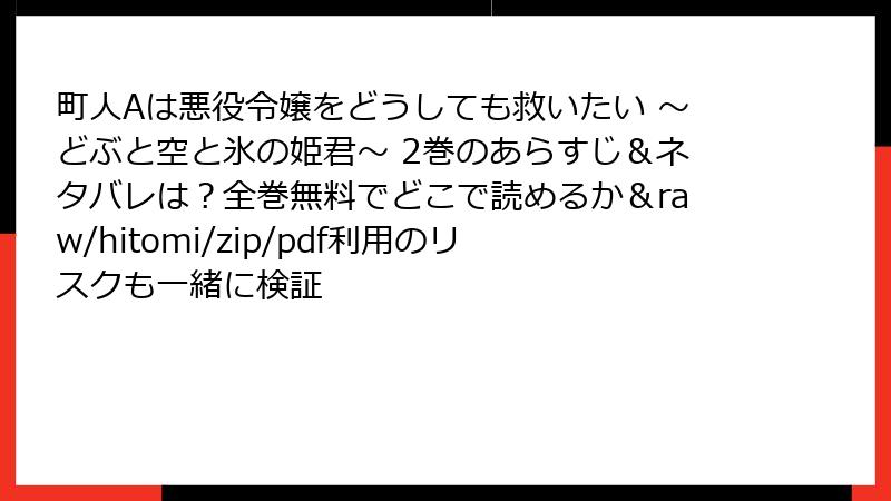 こんにちは、マンガを愛するブロガー、コミックマニアです! 『町人Aは悪役令嬢をどうしても救いたい ~どぶと空と氷の姫君~』は、転生ものと成り上がりストーリーの魅力が詰まった話題作で、2巻の展開に心を奪われたファンも多いはず。しかし、無料で読めるからと、raw、hitomi、zip、pdf、漫画バンクなどの海賊版サイトに手を出すのは危険がいっぱい! 今回は、こうした海賊版サイトでマンガを読むことのリスクを、法的・技術的・倫理的な観点から徹底解説します。この記事を読めば、なぜ正規ルートで楽しむべきかがバッチリ分かりますよ。では、早速本題に飛び込みましょう!