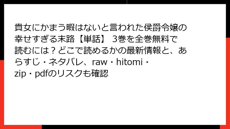 こんにちは、漫画愛好家の皆さん! 今回は、橘花明先生作画、日車メレ先生原作の人気ファンタジーロマンス漫画『貴女にかまう暇はないと言われた侯爵令嬢の幸せすぎる末路』を、raw、hitomi、zip、pdf、漫画バンクなどの海賊版サイトで読むことのリスクについて、詳しく解説します。この漫画の甘いストーリーや胸キュン展開に夢中の方も多いと思いますが、無料で読める誘惑に負けて海賊版サイトを利用するのは、実は大きな危険が潜んでいます。この記事では、