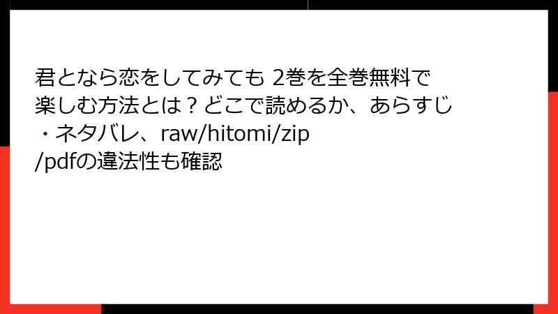 『君となら恋をしてみても』を海賊版サイトで読むのは、魅力的な誘惑ですが、リスクの山。法的罰則、ウイルス感染、プライバシー侵害、経済損失が、あなたの日常を一変させるかも。代わりに、電子書籍ストアや公式アプリで合法的に楽しめば、高品質な読書体験と作者支援が叶います。無料お試しキャンペーンも充実してるんですよ! 安全第一で、ピュアな恋物語を純粋に味わいましょう。皆さんの体験談やおすすめ正規サービスを、コメントでシェアしてくださいね♪