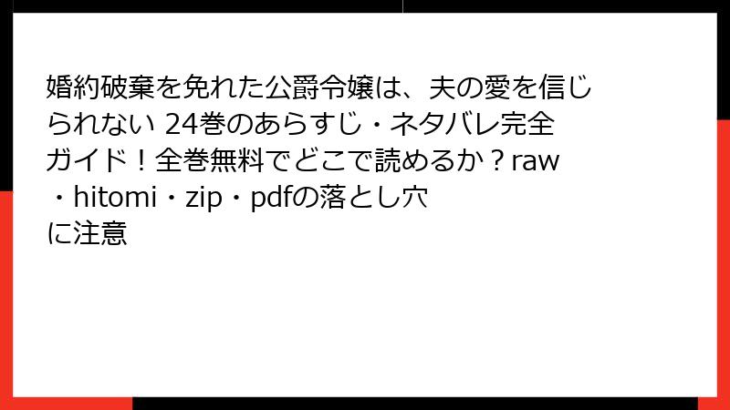 こんにちは、漫画愛好家の皆さん! ロマンス漫画の魅力にハマっているブロガーのみゆきです。今日は、大人気作品『婚約破棄を免れた公爵令嬢は、夫の愛を信じられない』を、raw、hitomi、zip、pdf、漫画バンクなどの海賊版サイトで読むことのリスクについて、徹底的に解説します。この作品は、霰屋こん先生原作、しきくれる先生作画による心揺さぶるロマンス漫画で、2025年10月時点で全26巻が刊行中。ヴィオレッタとアシュレイの切ない愛に胸キュンなファンも多いですよね!