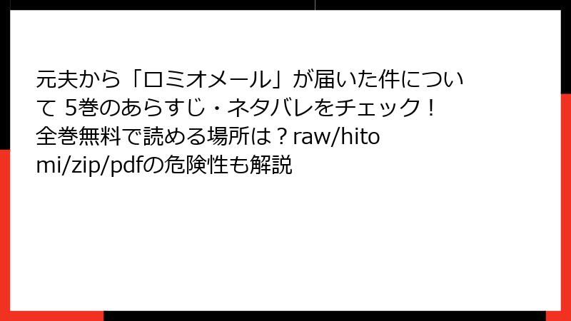 こんにちは、マンガ大好きブロガーのマンガマニアです! 今回は、離婚後のバツイチOLが元夫の執拗な「ロミオメール」に翻弄されつつ、新たな恋に挑む人気作『元夫から「ロミオメール」が届いた件について』の電子書籍版が、どのサービスで読めるのかを詳しくお届けします。2025年10月5日時点の最新情報を基に、コミックシーモア、ブックライブ、まんが王国、ebookjapan、Renta!、めちゃコミック、ピッコマ、LINEマンガなどの主要プラットフォームを徹底チェック。独占配信の影響で配信状況に差が出ていますが、お得に読むコツも交えつつ、読み応え満点で解説します。未読の方はネタバレ注意! さっそく、配信の全体像から見ていきましょう。