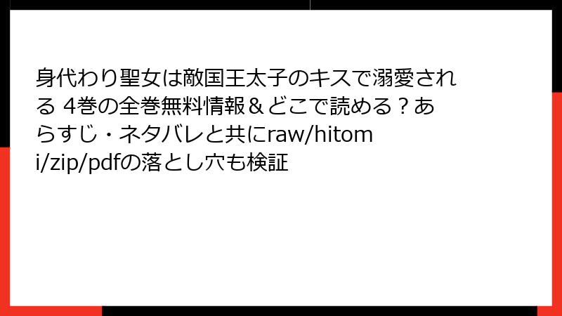 こんにちは、漫画愛好家の皆さん! 今回は、織部ソマリさん原作、うめ五郎さん作画の人気ファンタジーロマンスコミック『身代わり聖女は敵国王太子のキスで溺愛される』を、raw、hitomi、zip、pdf、漫画バンクなどの海賊版サイトで読むことのリスクについて、徹底的に解説します。無料で読める誘惑は魅力的ですが、そこには法的な問題から個人情報の危険まで、さまざまな落とし穴が潜んでいます。この記事では、具体的なリスクをわかりやすく整理し、なぜ正規ルートで楽しむべきかをブログ形式で詳しくお届け。読み応えのある内容で、漫画ファンの皆さんに警鐘を鳴らします!