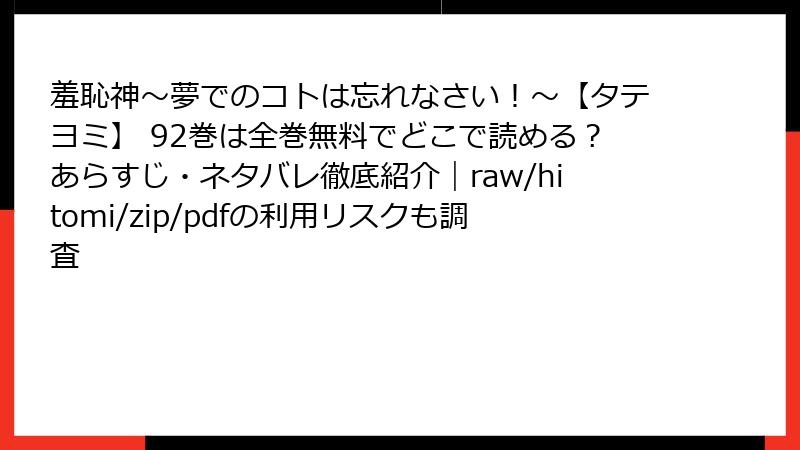 こんにちは、漫画大好きブロガーのあいうえおです! 『羞恥神~夢でのコトは忘れなさい!~【タテヨミ】』は、ドキドキのラブコメとユニークな設定で大人気の漫画ですが、無料で読みたいという誘惑から、raw、hitomi、zip、pdf、漫画バンクなどの海賊版サイトに手を出してしまう人もいるかもしれません。しかし、これらのサイトを利用することは、重大なリスクを伴います。今回は、92巻の話題から少し離れて、海賊版サイトでこの漫画を読むことの危険性を徹底解説します。法的、倫理的、技術的な観点から、なぜ正規のプラットフォームを選ぶべきかをブログ記事形式で詳しくお伝えします。さっそく、危険の全貌を見ていきましょう!