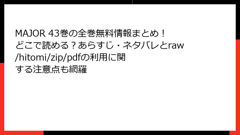『MAJOR』43巻の聖秀学院vs海堂高校の激闘は、野球漫画の醍醐味が詰まった名エピソード。しかし、raw、hitomi、zip、pdf、漫画バンクなどの海賊版サイトで読むことは、法的リスク、セキュリティの危険、品質の低下、そして作者や業界へのダメージにつながります。安易な「無料」に飛びつく前に、こうしたリスクを理解し、正規ルートで作品を楽しむことをおすすめします。『MAJOR』の「Never Give Up!!」の精神を胸に、漫画文化を正しく応援しましょう! 皆さんはどうやって『MAJOR』を楽しんでいますか? コメントで教えてくださいね。