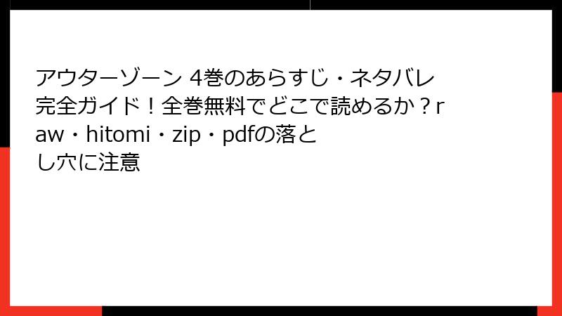 raw、hitomi、zip、pdf、漫画バンクなどの海賊版サイトは、短期的な快楽の代わりに長期的な損失を約束します。法的罰金、デバイス故障、プライバシー侵害、業界衰退、健康被害――これらを避けるには、電子書籍サービス(例: Kindle、BookWalker)や図書館の利用が最適。無料トライアルやセールも充実しており、2025年現在、合法で『アウターゾーン』を満喫できる環境は整っています。リスクを理解し、クリエイターを支える選択を。あなたの次のページは、安全なものにしましょう!