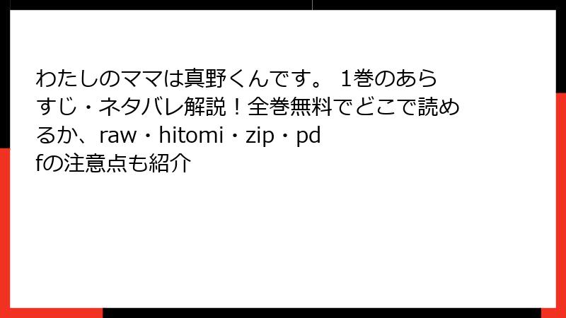 『わたしのママは真野くんです。』をraw、hitomi、zip、pdf、漫画バンクなどの海賊版サイトで読むことは、法的リスク、セキュリティの危険、業界への悪影響、倫理的な問題を引き起こします。好きな作品だからこそ、作者と作品を尊重し、正規版で楽しむのがファンとしての正しい選択。瑞希と真野さんの甘い物語を、安全に、気持ちよく読み進めるために、ぜひ正規ルートを選んでください。マンガの未来を守りながら、心温まるラブコメを堪能しましょう! 皆さんのマンガ愛を、コメントで聞かせてくださいね♪
