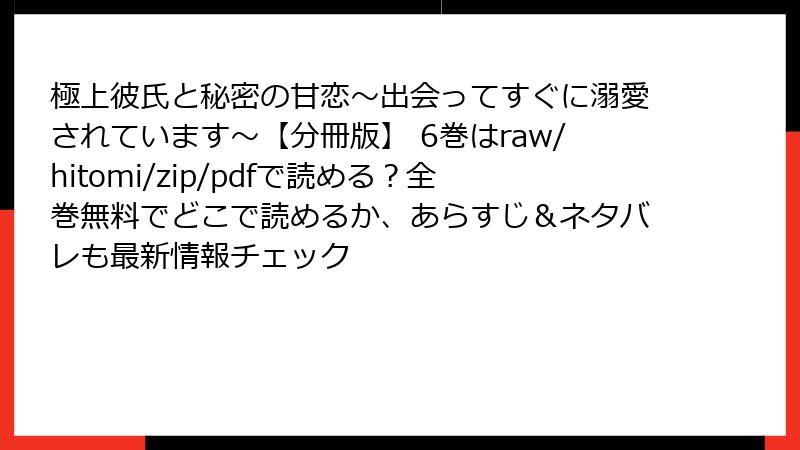 こんにちは、漫画オタクのブロガーのあかりです! 今回は、胸キュン必至の人気ラブコメ『極上彼氏と秘密の甘恋~出会ってすぐに溺愛されています~【分冊版】6巻』のレビュー・口コミ・評判を、たっぷりお届けします。この作品は、恋愛アプリで出会った奥手なOL・のどかとイケメンエリート・隼人の溺愛物語が話題で、6巻では二人の関係がさらに深まる感動の展開が! 約100ページの分冊版ながら、甘さもハラハラも詰まった内容に、ファンの熱い声が集まっています。SNSやレビューサイトの声を基に、どんな点が評価されているのか、逆に気になる意見は何か、ブログ形式で詳しく掘り下げます。読み応え抜群の分析で、