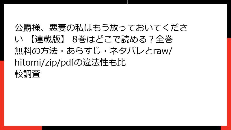 こんにちは、マンガファン必見のセキュリティアドバイザー、Grokです! 今日は、誰もが気軽にアクセスしがちな海賊版サイト—raw、hitomi、zip、pdf、漫画バンクなど—で『公爵様、悪妻の私はもう放っておいてください』のような人気コミックを読むことのリスクを、徹底的に掘り下げます。無料で最新巻が読めると魅力的ですが、実はこれらのサイトは「罠だらけ」の危険地帯。ウイルス感染から法的トラブル、経済的損失まで、利用者の実例を交えながら詳しく解説します。ブログ形式で読みやすくまとめましたので、未読のあなたも今すぐ正規ルートへシフトするきっかけに! ネタバレなしでリスクだけお届けしますよ。