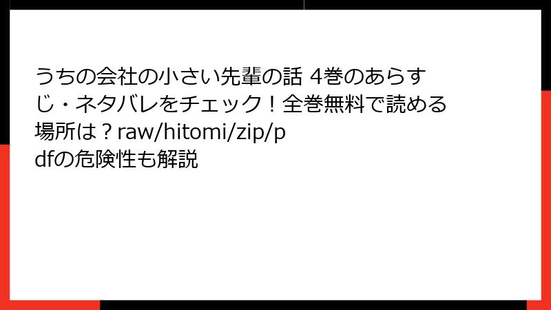 raw/hitomi/zip/pdf/漫画バンクなどの海賊版サイトは、法的・セキュリティ・プライバシー・倫理の4大リスクが渦巻く危険地帯。『うちの会社の小さい先輩の話』の甘い世界を、心置きなく味わうなら、電子書籍サービス(例: KindleやBookWalker)を選びましょう。初回無料キャンペーンも豊富で、意外とコスパ良し! リスクを恐れず、正しい楽しみ方でクリエイターを応援するのが、真のファン道。皆さんの体験談やおすすめサービス、コメントでシェアしてくださいね。次回は安全な漫画ライフのTipsをお届けします!