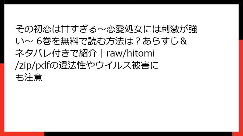 こんにちは、漫画愛好家のたかしです! 今日は、誰もが一度は気になってしまう『その初恋は甘すぎる~恋愛処女には刺激が強い~』のような人気コミックを、海賊版サイト(raw、hitomi、zip、pdf、漫画バンクなど)で読むことのリスクについて、徹底的に掘り下げていきます。無料で最新巻をサクッと読めちゃうなんて魅力的ですよね。でも、その裏側には想像以上の危険が潜んでいます。法的トラブルから個人情報漏洩、デバイス破壊まで…。この記事では、最新の情報(2025年時点)に基づいて、具体的なリスクを多角的に解説。読んだ後には、正規ルートで楽しむ重要性がきっと実感できるはずです。では、さっそく本題へ!
