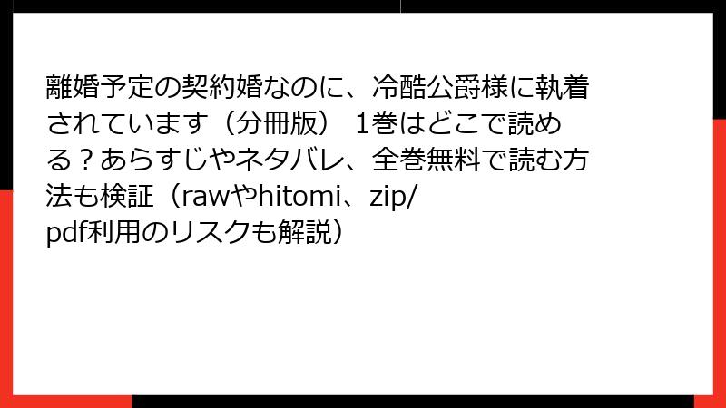 こんにちは、マンガ愛好家の皆さん! 今日は、魅力的なファンタジーロマンス『離婚予定の契約婚なのに、冷酷公爵様に執着されています(分冊版) 1巻』のような作品を、海賊版サイト(raw、hitomi、zip、pdf、漫画バンクなど)で読もうとするリスクについて、徹底的に掘り下げます。無料で手軽に読めそうに見えるこれらのサイトですが、実は法的・セキュリティ・倫理的な落とし穴が満載。ブログ形式で、具体例を交えながら詳しく解説します。未読の皆さんはネタバレなしで安心してくださいね。海賊版の誘惑に負けず、正規ルートで楽しむためのヒントも最後に! さあ、危険性を一緒に紐解いていきましょう。