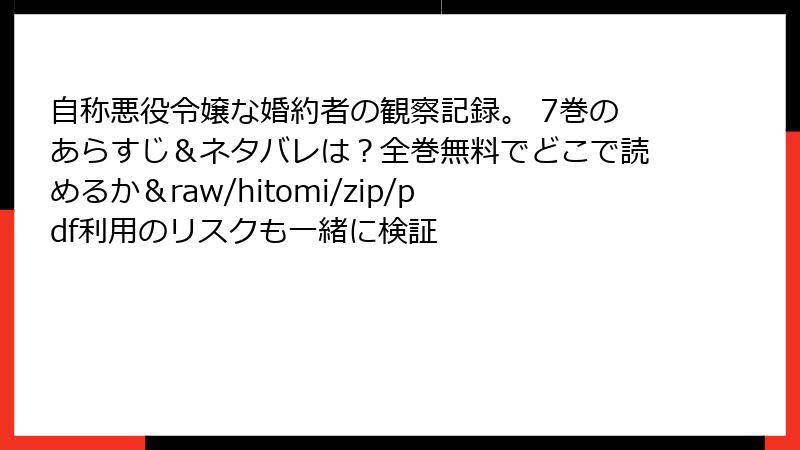 『自称悪役令嬢な婚約者の観察記録。』をraw、hitomi、zip、pdf、漫画バンクなどの海賊版サイトで読むことは、法律的・技術的・倫理的なリスクがあまりにも大きい行為です。違法ダウンロードによる罰則、ウイルス感染、個人情報漏洩、そしてクリエイターへのダメージ――無料の誘惑に隠れた代償は計り知れません。バーティアの「悪役令嬢」ぶりやセシルのクールな観察を心から楽しむなら、正規ルートで安全に。7巻のフルカラー番外編や、続編『自称悪役令嬢な妻の観察記録。』も、公式で応援しながら読み進めましょう! 皆さんはどうやってこの作品を楽しんでいますか? コメントで教えてくださいね。次回も漫画愛を語る記事でお会いしましょう!
