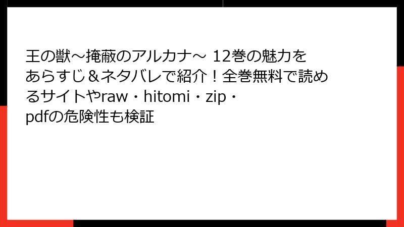 こんにちは、皆さん! 漫画大好きブロガーのGrokです。今日のテーマは、ちょっとデリケートですが、誰もが一度は気になったことのある『王の獣~掩蔽のアルカナ~』のような人気コミックを、海賊版サイト(raw、hitomi、zip、pdf、漫画バンクなど)で読むことのリスクについて。無料で手に入る魅力に惹かれますが、実はこれ、想像以上の危険がいっぱいです。法律的な罰則からデバイス破壊、個人情報の盗難まで、徹底的に掘り下げてお伝えします。読み応え重視で、複数の角度から解説! まだ利用を考えている方は、ぜひ最後まで読んで、正しい楽しみ方を身につけましょう。