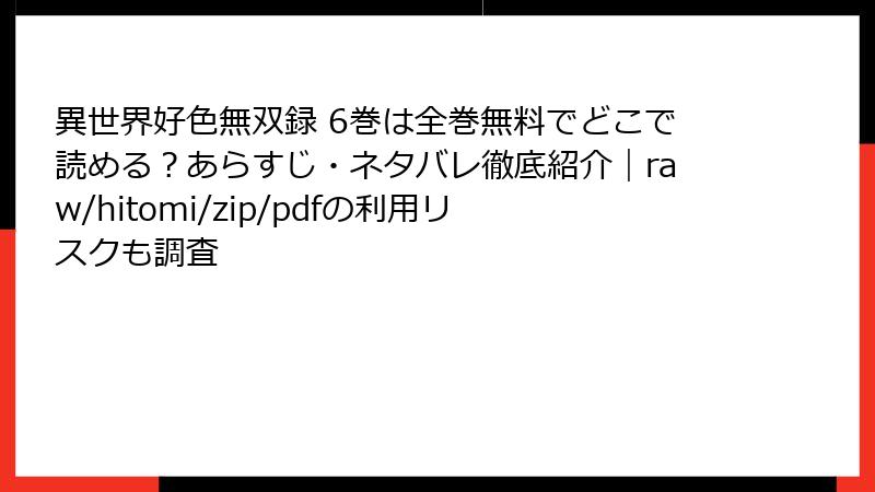 『異世界好色無双録 ~異世界転生の知恵と力を、ただひたすら××××するために使う~』は、講談社ヤンマガWebで連載中の大人気漫画で、その過激なエロとカオスなストーリーがファンを魅了しています。しかし、無料で読める誘惑から、raw、hitomi、zip、pdf、漫画バンクといった海賊版サイトに手を出してしまう人もいるかもしれません。今回のブログでは、これらの海賊版サイトで漫画を読むことのリスクを徹底解説! 法的問題から個人情報の危険、さらにはデバイスへの脅威まで、詳細に掘り下げます。『異世界好色無双録』を安全に楽しむためにも、ぜひこの記事を最後まで読んで、海賊版サイトの罠を回避しましょう!