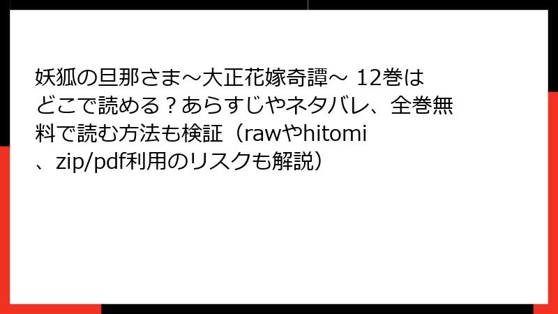 『妖狐の旦那さま~大正花嫁奇譚~』をraw、hitomi、漫画バンクなどの海賊版サイトで読むことは、法的リスク、セキュリティの危険、作者や業界へのダメージ、品質の低下、そして倫理的問題を引き起こします。好きな作品を長く楽しむためにも、正規の購入を選び、作者や業界を応援しましょう。12巻の感動的なシーンや美しいイラストを、安心して高品質で味わうために、今日から合法的な方法を試してみませんか? あなたの推し作品を、正しい形で愛し続けましょう!