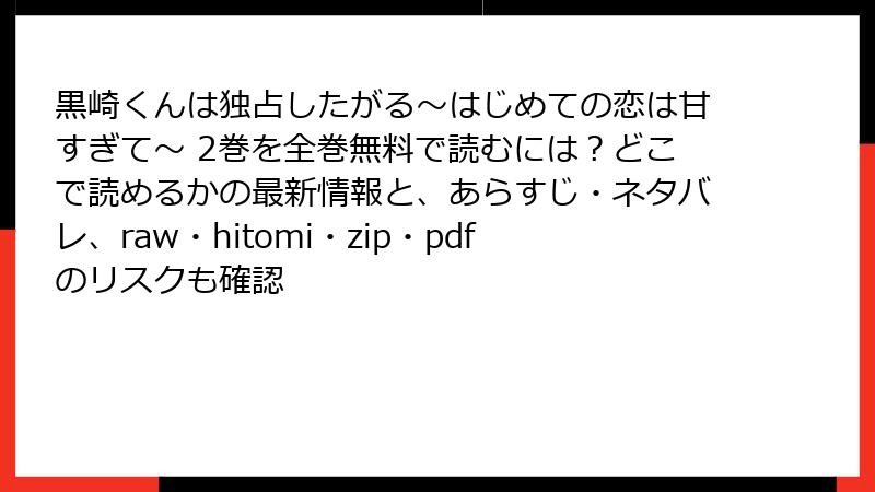 『黒崎くんは独占したがる~はじめての恋は甘すぎて~』をraw、hitomi、漫画バンクなどの海賊版サイトで読むことは、法的、技術的、倫理的なリスクを伴う危険な行為です。罰金や個人情報漏洩、クリエイターへの損害など、デメリットがあまりにも大きい。漫画は、作者や業界を支えながら楽しむのがファンとしての醍醐味。2巻の黒崎くんの独占欲たっぷりのシーンを、心置きなく味わうためにも、正規の購入ルートを選びましょう!