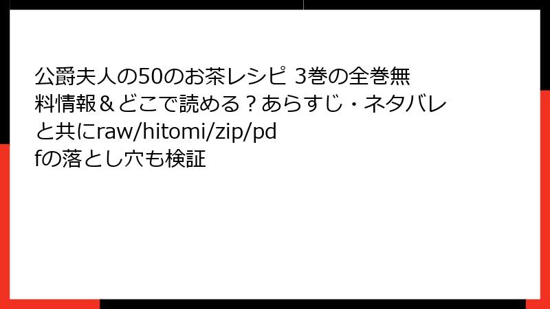 こんにちは、漫画ファンの皆さん! 人気の異世界転生ロマンス『公爵夫人の50のお茶レシピ』のような作品を、ついつい無料で読みたい衝動に駆られること、ありますよね。でも、raw、hitomi、zip、pdf、漫画バンクなどの海賊版サイトを利用するのは、想像以上の危険が潜んでいます。この記事では、そんなサイトのリスクを徹底的に掘り下げて解説します。法的トラブルからセキュリティの脅威、さらには業界への影響まで、読み応え満点でお届け。無料の誘惑に負けず、正規ルートを選ぶためのヒントも交えつつ、ブログ風に進めていきましょう。未読のネタバレは避けていますが、警鐘としてお読みください!