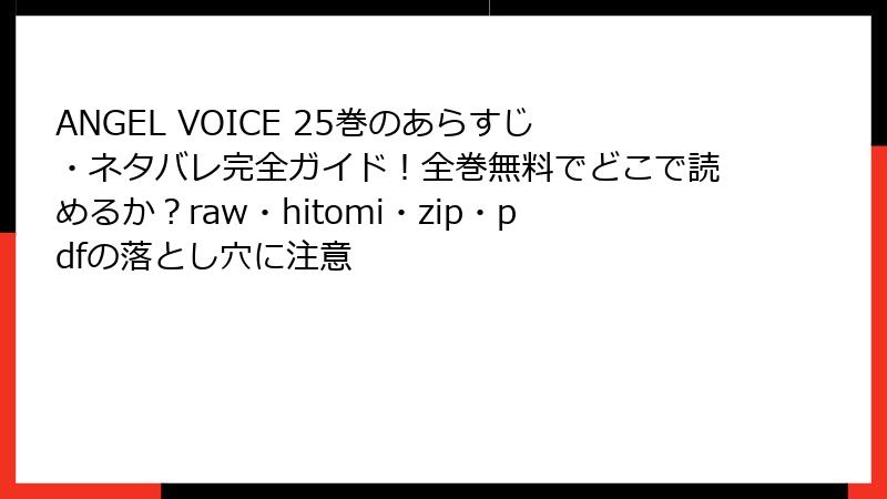 raw、hitomi、zip、pdf、漫画バンクなどのサイトは、著作権者の許可なく漫画を無断スキャン・アップロードした違法プラットフォームです。rawは日本語の生データ版が豊富で、hitomiはアダルト寄りの画像共有(同人誌中心)、zipやpdfは圧縮ファイルでダウンロード可能、漫画バンクは有名なリーチサイト(閉鎖後もHAKARAWやMANGA ZIPなどの後継が跋扈)。これらで『ANGEL VOICE』の25巻のようなエピソードを即閲覧できるのは魅力的ですが、運営者は国外サーバーを使い、広告収入やユーザー データ収集で利益を上げています。