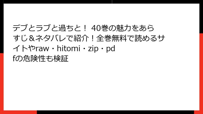 こんにちは、漫画大好きブロガーのあやかです! 『デブとラブと過ちと!』は、ままかり先生の描く笑いと感動のラブコメで、40巻ともなると夢子のドタバタ劇にハマる読者が続出! でも、無料で読みたいからと「raw」「hitomi」「zip」「pdf」「漫画バンク」などの海賊版サイトに手を出そうとしている方、ちょっと待って! これらのサイトで漫画を読むことは、あなた自身やクリエイター、さらには社会全体に深刻なリスクをもたらします。この記事では、海賊版サイトを利用する危険性を、法律、倫理、セキュリティの観点から詳しく解説。ブログ形式で、読み応えのある内容をお届けします!
