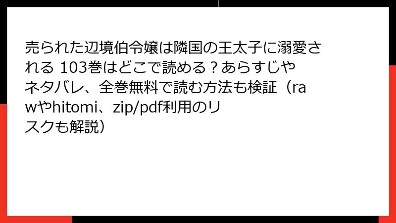 こんにちは、漫画ファンのみなさん! 『売られた辺境伯令嬢は隣国の王太子に溺愛される』は、溺愛ロマンスとファンタジー要素が魅力の大人気作品ですよね。103巻も話題沸騰中ですが、無料で読みたいという誘惑から、raw、hitomi、zip、pdf、漫画バンクなどの海賊版サイトに手を出そうと考えている方もいるかもしれません。しかし、こうした海賊版サイトを利用することは、重大なリスクを伴います。このブログでは、海賊版サイトで漫画を読むことの危険性を、法的、技術的、倫理的な観点から詳しく解説します。読み応えのある内容で、しっかりお伝えするので、ぜひ最後までお読みください!