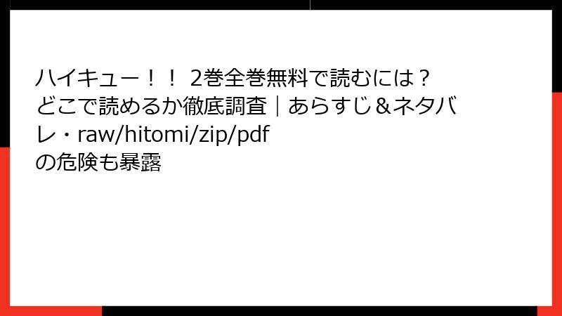 rawやhitomi、zip/pdf、漫画バンクなどの海賊版サイトは、法的罰則、ウイルス感染、個人情報流出、経済・社会的ダメージの四重苦。『ハイキュー!!』の熱いバレーシーンを、心置きなく楽しむなら、正規サービス(例: 電子書籍ストアの無料試し読みやサブスク)がベストチョイスです。リスクを避け、作者を応援する習慣を身につけましょう。皆さんの安全な漫画ライフを祈っています! 何か体験談があれば、コメントでシェアしてくださいね。