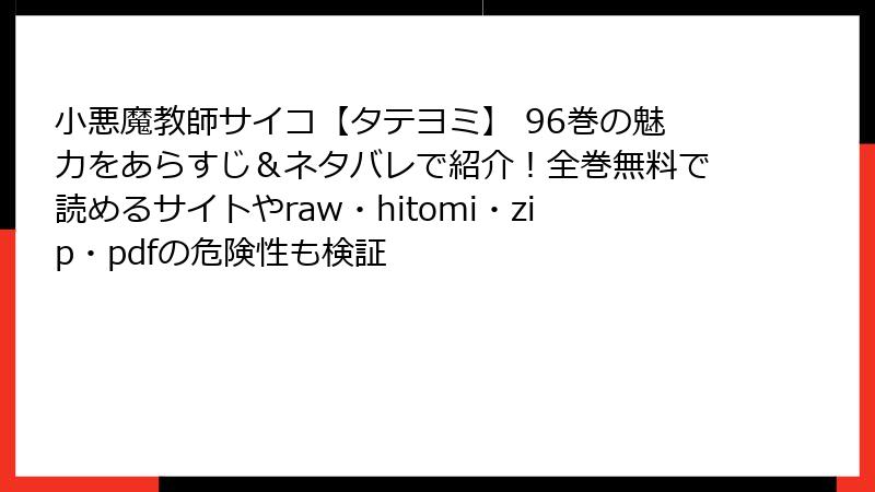 こんにちは、漫画ファンの皆さん! 今回は、サイコスリラー漫画の金字塔、小悪魔教師サイコ【タテヨミ】96巻のレビュー・口コミ・評判を徹底解説します。このタテヨミ版は、フルカラーの縦スクロール形式で展開され、葛西心春先生の狂気と教育愛が織りなす物語が話題に。96巻は新キャラ登場や過去の因縁が絡む重要エピソードで、SNSやレビューサイトで賛否両論が飛び交っています。2025年10月時点の最新の声を集め、良い点・悪い点を整理しつつ、読み応えのあるブログ形式で紹介します。ネタバレは控えめに、でも熱量たっぷりでお届け! さっそく、読者のリアルな反応を見ていきましょう。