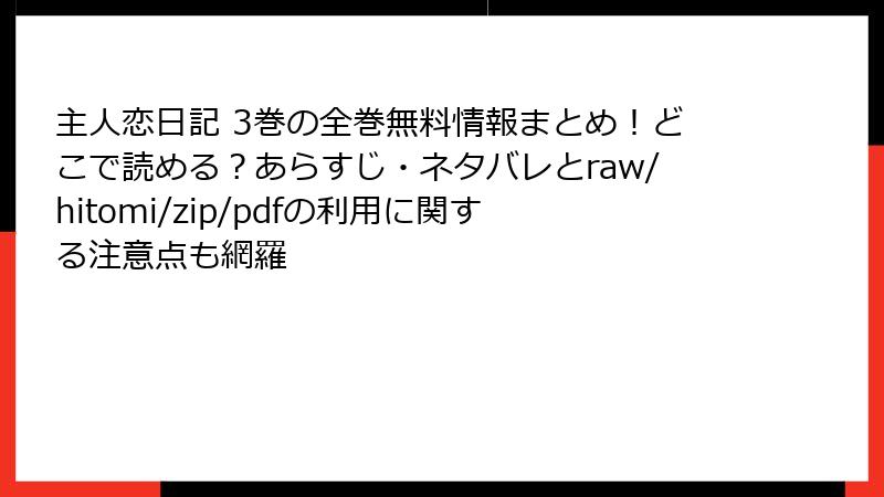 こんにちは、漫画ファンの皆さん! 人気のラブコメ『主人恋日記』を無料で読みたい気持ち、わかります。でも、raw、hitomi、zip、pdf、漫画バンクなどの海賊版サイトを利用するのは、想像以上の危険が潜んでいます。この記事では、そんなサイトのリスクを徹底的に掘り下げます。法的トラブルからサイバー攻撃、さらには業界への悪影響まで、具体例を交えて解説。読み終わったら、正規ルートで作品を楽しむ重要性がきっと実感できるはずです。では、さっそく本題へ!