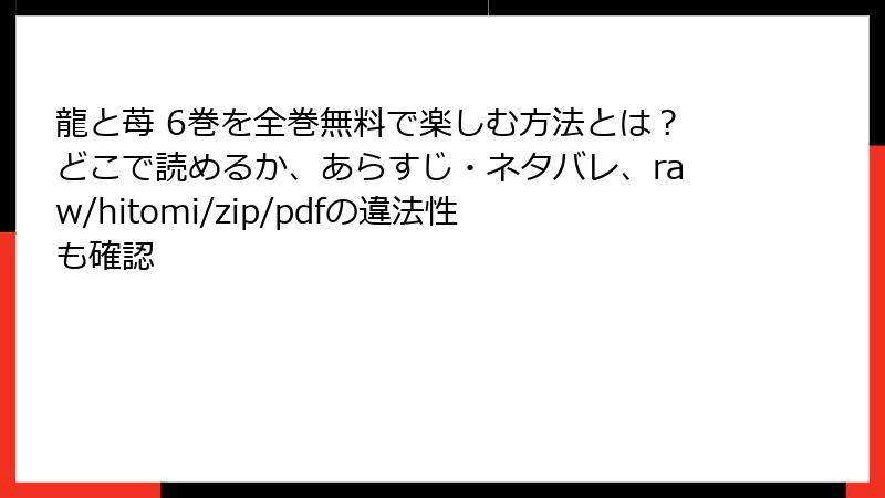 海賊版サイトのリスクは、法的に捕まる、端末壊れる、情報盗まれる、クリエイター泣かせる…と全方位攻撃。無料の代償が大きすぎます。代わりに、公式電子書籍やサブスクサービスを使えば、安全・高画質・特典満載で楽しめます。『龍と苺』も正規で読んで、作者を応援しましょう! もし過去に利用したかも…と思ったら、セキュリティチェックを今すぐ。みんなで健全な漫画文化を守りましょう♪ コメントであなたの体験談、待ってます!