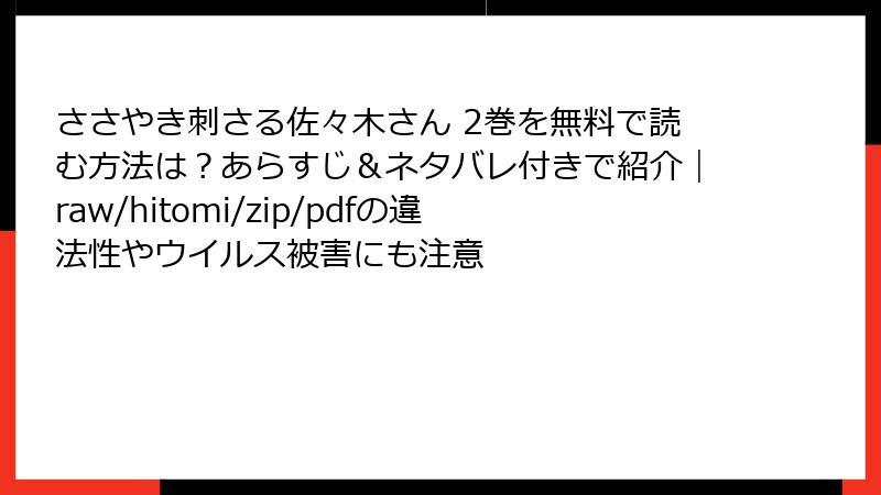 こんにちは、漫画愛好家の皆さん! 人気急上昇中の『ささやき刺さる佐々木さん』2巻。ASMR要素満載の甘いラブコメに心奪われ、つい「無料で読みたい!」と海賊版サイト(raw、hitomi、zip、pdf、漫画バンクなど)に手を出したくなる気持ち、わかります。でも、待って! その一時の快楽が、深刻なリスクを招くんです。この記事では、海賊版利用の危険性を徹底解説。法律面からセキュリティ、倫理まで、読み応え満点で掘り下げます。作者のむらた壱先生の努力を無駄にせず、正規ルートで楽しむための警鐘としてお読みください。ネタバレなしでリスクだけにフォーカスですよ!