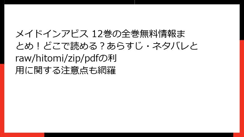 人気漫画『メイドインアビス』を、raw、hitomi、zip、pdf、漫画バンクなどの海賊版サイトで無料で読もうとする人は少なくありません。しかし、これらのサイトは魅力的な「タダ読み」の誘惑の裏に、深刻なリスクが潜んでいます。ウイルス感染から法的トラブル、さらには個人情報の漏洩まで、日常のエンタメが悪夢に変わる可能性大。この記事では、海賊版サイトの具体的な危険性を、セキュリティ、法律、倫理の観点から詳しく解説します。作者のつくしあきひと氏の努力を尊重し、正規ルートで楽しむことを強くおすすめしますが、まずはリスクを徹底的に知っておきましょう。