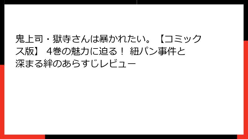 こんにちは、BL漫画を愛してやまないブロガー、マンガマニアです! 今回は、あらた六花先生の大人気作『鬼上司・獄寺さんは暴かれたい。【コミックス版】』の第4巻について、ネットやSNSで飛び交うレビュー・口コミ・評判を詳しく掘り下げます。この巻は、獄寺さんの大阪転勤からの東京帰還を機に、謎の「紐パン事件」が巻き起こり、庄司くんとの関係がさらに深まる激アツ展開。BLファンから絶賛の声が止まらない理由を、実際の口コミを基に分析し、ブログ形式でたっぷりお届けします。ネタバレは控えめに、読み応えのある内容で、なぜこの巻がシリーズ屈指の名巻と呼ばれるのか迫ります。それでは、早速レビューをチェックしていきましょう!