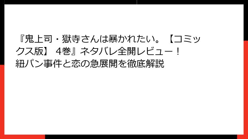こんにちは、BL漫画をこよなく愛するブロガー、マンガマニアです! 今回は、あらた六花先生の大人気作『鬼上司・獄寺さんは暴かれたい。【コミックス版】』の第4巻を、ネタバレ全開で徹底的に掘り下げます。この巻は、獄寺さんの大阪転勤からの東京帰還を機に、謎の「紐パン事件」が巻き起こり、庄司くんとの関係がさらに深まる激アツ展開! エロティックなシーンと甘いラブストーリーが絶妙に絡み合い、ファンなら悶絶必至の内容です。本記事は完全ネタバレなので、未読の方はご注意を! さっそく、4巻の核心に迫るエピソードを章ごとに解説していきます。準備はいいですか?