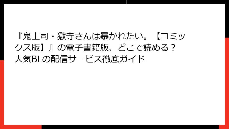 こんにちは、BL漫画ファン必見のブロガー、マンガマニアです! あらた六花先生の傑作『鬼上司・獄寺さんは暴かれたい。【コミックス版】』は、鬼上司・獄寺さんと社畜ワンコ部下・庄司くんのギャップ萌え満載のエロ甘ストーリーで、今も熱い支持を集めています。2025年2月には5巻が発売予定で、電子書籍版の需要も高まっていますよね。そんな中、皆さんから「どこで読めるの?」という質問がたくさん! 今回は、コミックシーモア、ブックライブ、まんが王国、ebookjapan、Renta!、めちゃコミック、ピッコマ、LINEマンガなどの主要サービスを中心に、配信状況を詳しく解説します。試し読みのしやすさや特典、クーポン情報も交えて、読み応えのあるガイドをお届け。合法的に楽しむための参考にどうぞ!