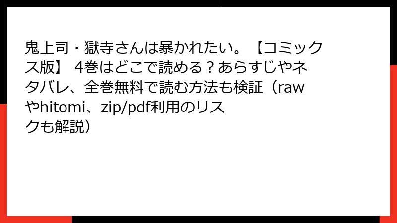 こんにちは、漫画愛好家の皆さん! マンガマニアです。今日は、大人気BL漫画『鬼上司・獄寺さんは暴かれたい。【コミックス版】』を、raw、hitomi、zip、pdf、漫画バンクなどの海賊版サイトで読むことの危険性について、詳しくお話しします。この作品は、あらた六花先生の魅力的なキャラとエロティックなストーリーでファンを魅了していますが、無料で読める誘惑に負けて違法サイトを利用するのは絶対NG! なぜなら、個人情報の漏洩や法的リスクなど、重大な問題が潜んでいるからです。この記事では、ネタバレなしで、海賊版サイト利用のリスクを徹底解説。ブログ形式で、読み応えのある内容をお届けしますので、ぜひ最後までお付き合いください!