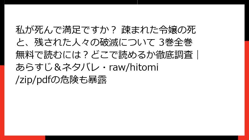 こんにちは、マンガ愛好家の皆さん! ブログ「マンガ安全読書ラボ」へようこそ。今日は、誰もが一度は気になってしまう海賊版サイト—raw、hitomi、zip、pdf、漫画バンクなどの違法プラットフォームで『私が死んで満足ですか? 疎まれた令嬢の死と、残された人々の破滅について』のような人気コミックを読むリスクについて、深掘りします。一見、無料で最新巻にアクセスできる夢のような世界ですが、2025年現在、これらのサイトは法的・セキュリティ・倫理的な落とし穴の塊。軽い気持ちで訪れると、取り返しのつかない被害に遭うケースが急増中です。この記事では、具体的なリスクを多角的に解説。読了後、正規ルートで楽しむ重要性を再認識できるはず! それでは、さっそく本題へ。