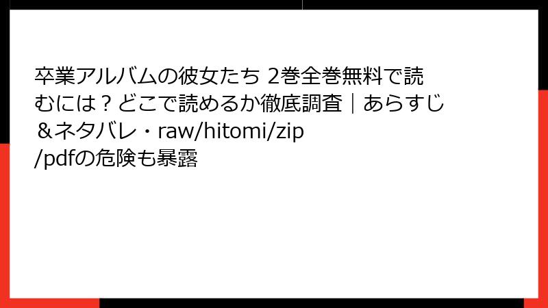 こんにちは、漫画愛好家の皆さん! 今回取り上げるのは、大人気ラブコメ漫画『卒業アルバムの彼女たち』を、raw、hitomi、zip、pdf、漫画バンクなどの海賊版サイトで読むことのリスクについてです。この作品は、三河ごーすと原作、伸びた髪の魅力的な作画で、青春と恋のドキドキを堪能できる一作ですが、無料で読める誘惑に駆られて海賊版サイトに手を出してしまうと、思わぬトラブルに巻き込まれる可能性があります。この記事では、海賊版サイトを利用する危険性を、法律、セキュリティ、倫理の観点から詳しく解説します。単なる「無料で読める」以上のリスクを、