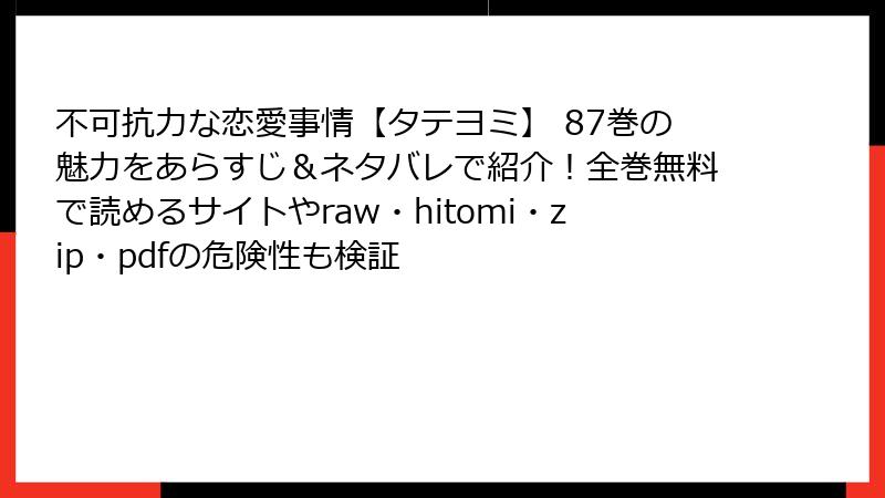 こんにちは、漫画ファンのみなさん! 不可抗力な恋愛事情【タテヨミ】は、Ginjyoさんとuzutokkengさんによる心揺さぶるBL作品で、87巻のドラマチックな展開が話題沸騰中です。しかし、この人気作品をraw、hitomi、zip、pdf、漫画バンクなどの海賊版サイトで読もうと考える方もいるかもしれません。今回は、これらの海賊版サイトを利用することのリスクを、法的、倫理的、技術的な観点から詳しく解説します。ブログ形式で、読み応えのある内容をお届けしますので、ぜひ最後までご覧ください!