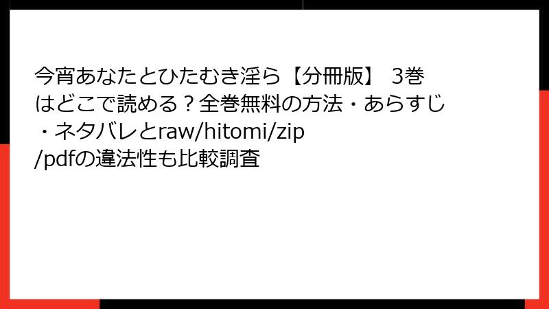 こんにちは、漫画愛好家の皆さん! 前回のネタバレ記事に続き、今回はちょっとシリアスなトピックをお届けします。「今宵あなたとひたむき淫ら【分冊版】」のような魅力的なラブロマンスを、raw、hitomi、zip、pdf、漫画バンクなどの海賊版サイトで「無料で読みたい!」と思う気持ち、わかりますよ。杏珠と響平の甘いシーンにすぐアクセスできるのは魅力的。でも、2025年現在、これらのサイトはただの「無料の罠」。法的罰則からデバイス破壊、個人情報漏洩まで、取り返しのつかないリスクが満載です。このブログでは、最新の事例を基にリスクを多角的に深掘り。読み終わったら、正規ルートで作品を応援したくなるはず! 安全第一で、漫画ライフを楽しんでいきましょう。