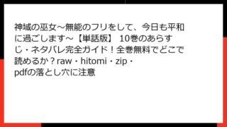 少年マンガ 神域の巫女〜無能のフリをして、今日も平和に過ごします〜【単話版】 10巻のあらすじ・ネタバレ完全ガイド!全巻無料でどこで読めるか?raw・hitomi・zip・pdfの落とし穴に注意 神域の巫女〜無能のフリをして、今日も平和に過ごします〜【単話版】 10巻 詳細あらすじレビューこんにちは、マンガ好きのブロガーです! 今日は、和風ファンタジーバトルが魅力の人気コミック『神域の巫女〜無能のフリをして、今日も平和に過ごします〜... 2025.10.06 少年マンガ神域の巫女〜無能のフリをして、今日も平和に過ごします〜【単話版】
