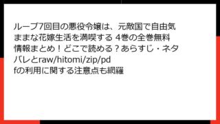 ループ7回目の悪役令嬢は、元敵国で自由気ままな花嫁生活を満喫する ループ7回目の悪役令嬢は、元敵国で自由気ままな花嫁生活を満喫する 4巻の全巻無料情報まとめ!どこで読める?あらすじ・ネタバレとraw/hitomi/zip/pdfの利用に関する注意点も網羅 ループ7回目の悪役令嬢は、元敵国で自由気ままな花嫁生活を満喫する 4巻:タイムループの果てに待つ甘い日常の深淵こんにちは、異世界ファンタジー大好きのブロガーです! 今日は、タイムループと悪役令嬢の要素が絶妙に融合した人気コミック『ループ7回... 2025.10.08 ループ7回目の悪役令嬢は、元敵国で自由気ままな花嫁生活を満喫する少女マンガ