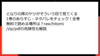 となりの席のヤツがそういう目で見てくる となりの席のヤツがそういう目で見てくる 1巻のあらすじ・ネタバレをチェック!全巻無料で読める場所は?raw/hitomi/zip/pdfの危険性も解説 となりの席のヤツがそういう目で見てくる 1巻:下心から始まる甘酸っぱいラブコメの魅力に迫るこんにちは、漫画好きのブロガーです! 今日は、最近話題沸騰中のラブコメ作品『となりの席のヤツがそういう目で見てくる』1巻について、詳しくあらすじを掘り... 2025.10.13 となりの席のヤツがそういう目で見てくる少年マンガ