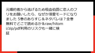 元婚約者から逃げるため吸血伯爵に恋人のフリをお願いしたら、なぜか溺愛モードになりました 元婚約者から逃げるため吸血伯爵に恋人のフリをお願いしたら、なぜか溺愛モードになりました 5巻のあらすじ&ネタバレは?全巻無料でどこで読めるか&raw/hitomi/zip/pdf利用のリスクも一緒に検証 元婚約者から逃げるため吸血伯爵に恋人のフリをお願いしたら、なぜか溺愛モードになりました 5巻:吸血鬼のプロポーズから結婚式へ! 甘々溺愛のクライマックスを徹底解説こんにちは、マンガ好きの皆さん! 今日は、pixivコミックで爆発的人気を博し... 2025.10.14 元婚約者から逃げるため吸血伯爵に恋人のフリをお願いしたら、なぜか溺愛モードになりました少女マンガ