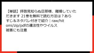 【単話】拝啓見知らぬ旦那様、離婚していただきます 【単話】拝啓見知らぬ旦那様、離婚していただきます 21巻を無料で読む方法は?あらすじ&ネタバレ付きで紹介|raw/hitomi/zip/pdfの違法性やウイルス被害にも注意 【単話】拝啓見知らぬ旦那様、離婚していただきます 21巻:すれ違いの果てに訪れる新たな試練みなさん、こんにちは! ロマンス好きのブロガー、恋愛小説マニアのあかりです。今日は、KADOKAWAのFLOS COMICから連載中の大人気漫画『拝啓... 2025.10.14 【単話】拝啓見知らぬ旦那様、離婚していただきます少女マンガ