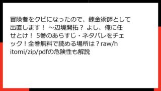 冒険者をクビになったので、錬金術師として出直します! ~辺境開拓? よし、俺に任せとけ! 冒険者をクビになったので、錬金術師として出直します! ~辺境開拓? よし、俺に任せとけ! 5巻のあらすじ・ネタバレをチェック!全巻無料で読める場所は?raw/hitomi/zip/pdfの危険性も解説 『冒険者をクビになったので、錬金術師として出直します! ~辺境開拓? よし、俺に任せとけ!』5巻 詳細あらすじレビューこんにちは、ファンタジー漫画好きのブロガーです! 今日は、スクウェア・エニックスの人気作『冒険者をクビになったので、錬金術... 2025.10.14 冒険者をクビになったので、錬金術師として出直します! ~辺境開拓? よし、俺に任せとけ!少年マンガ